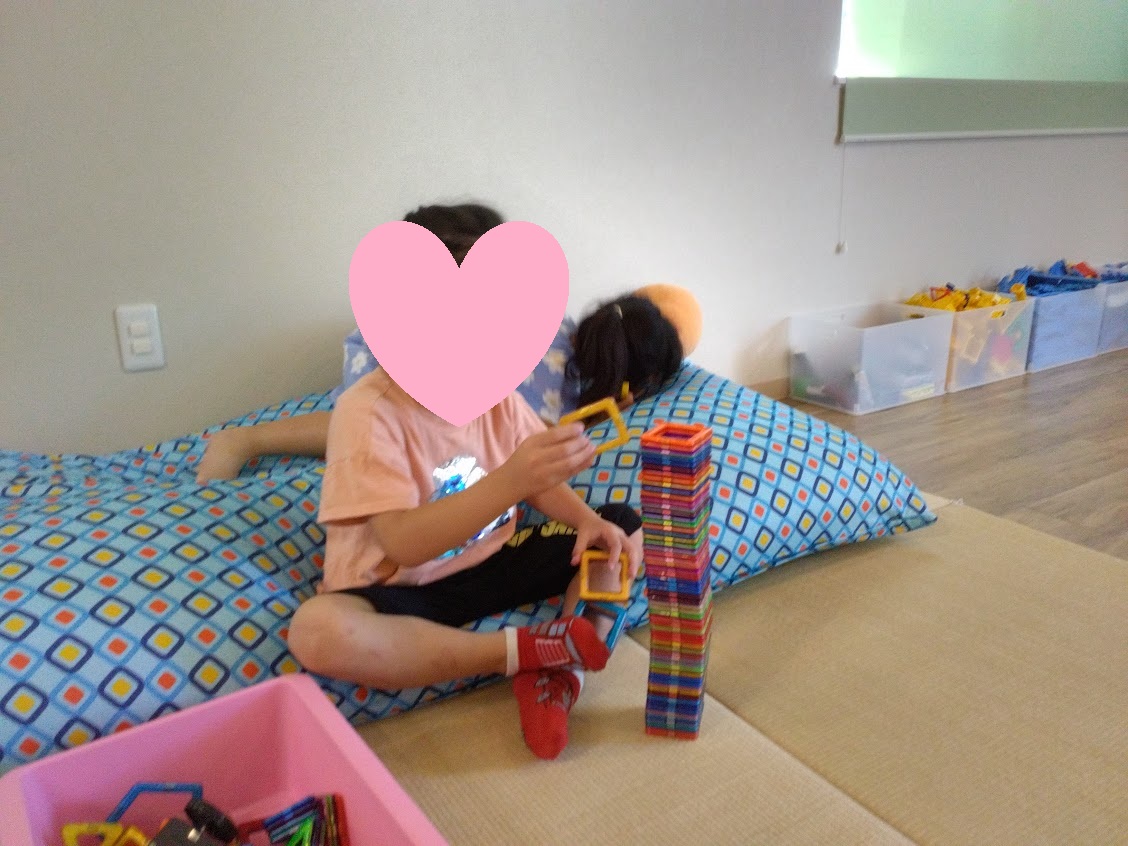 自由遊びの時間、マグフォーマーを積み上げているお子さんが