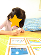 今回の活動は【聴覚的理解力】と【視覚的注意力】を目的に行っており、ある動物の特徴を伝えられたお子さんたちは、部屋に隠された答えのカードを探しに行き、手元のシートに貼って記念写真に模したものを完成させる、といったものになっています。