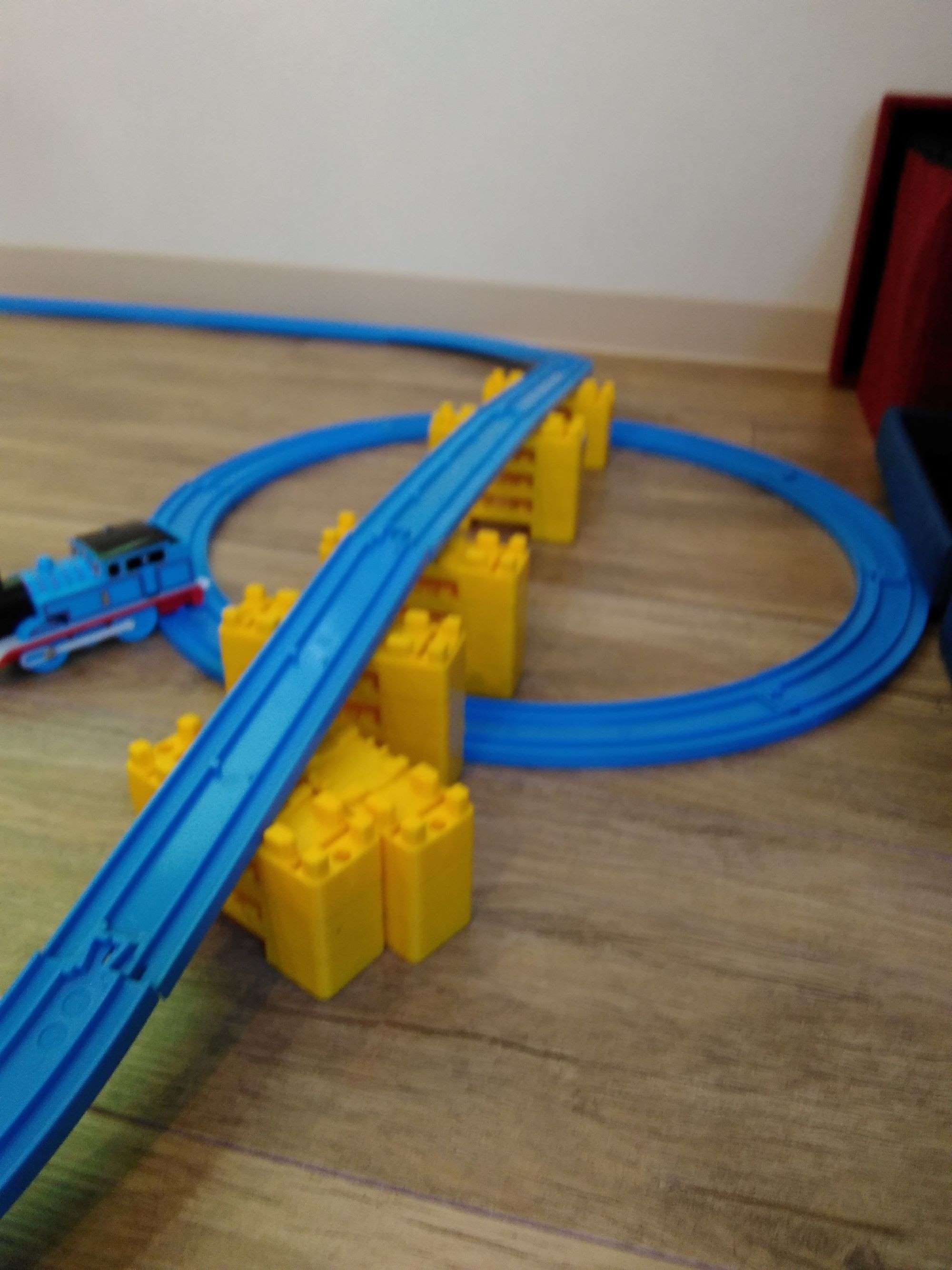 さて、今日は自由時間にお子さんが作ったプラレールをご紹介します。お子さんに大人気の玩具の一つでもあるプラレール。普通に平面の線路だけかと思いきや、な、な、なんと!写真のように高低差をつけて線路をつなげていました。お子さんの想像力や表現力は無限大とはよく耳にしますが、毎日このように驚きがいっぱいで嬉しいですね。