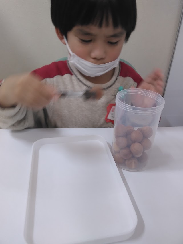 今日は個別課題のについてです。木の玉を小さなトングで挟んで、プラスチックの容器に移し入れる課題です。トングをきちんと使えることや指先の力、また目できちんと最後まで木の玉を追うことも大切です。すごく集中して行わないとできないですよね。お子さんの集中力は本当に凄いです!!!