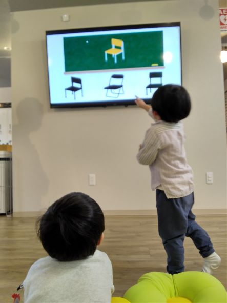 見本になるイラストと、その下に表示されるシルエットを見て、同じものを探すというのが今回のルールです。シルエットになっているということは、見本となるイラストの形を確実に理解していないとクリアできないんですね。ですが、スマイルに来ているお子さんたちは、この問題にも慣れてきたのか、全員が正解する頻度の多いこと多いこと…。問題作成者としても嬉しいですね🙆