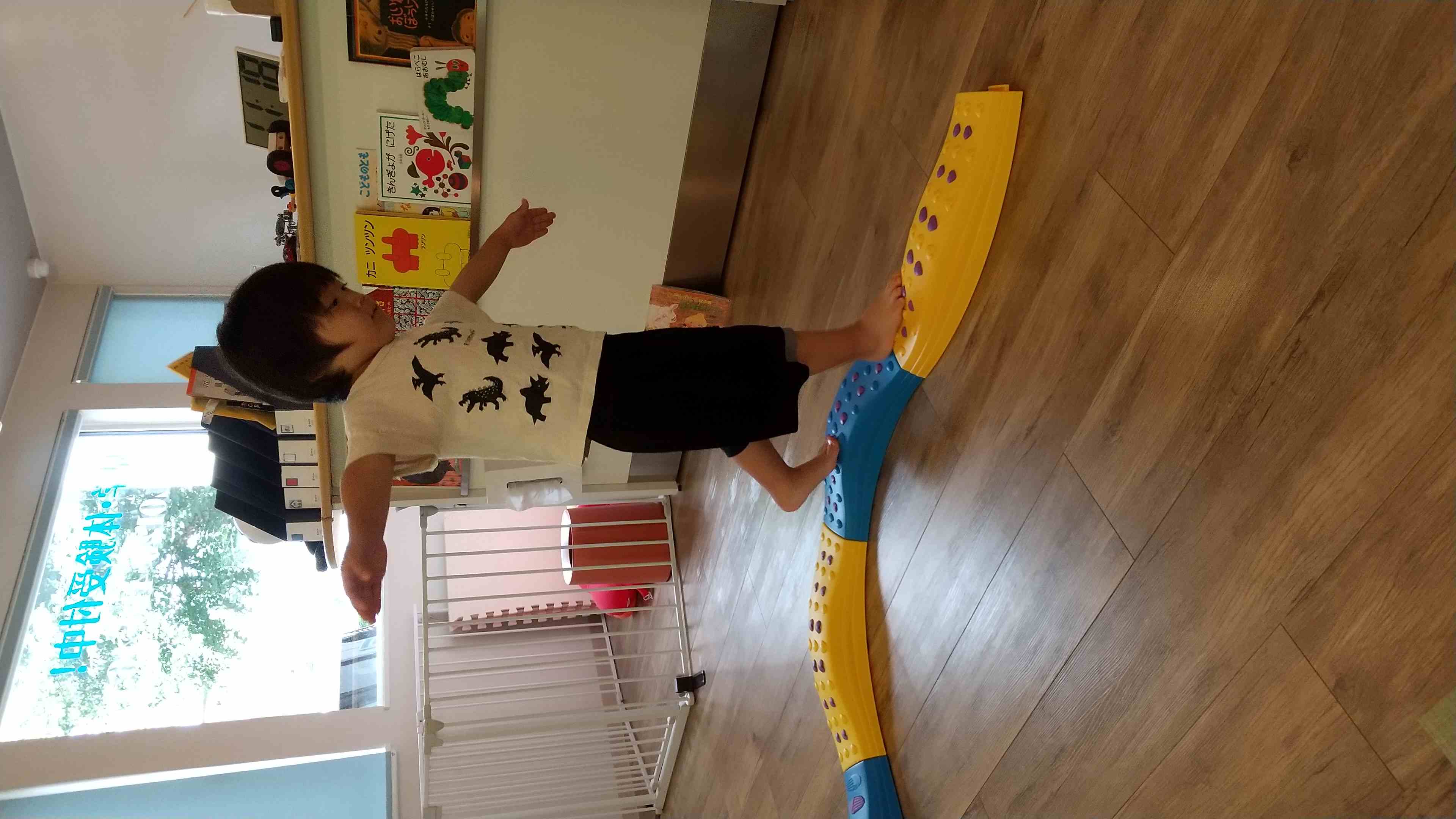 最初は平均台からすぐに落ちてしまいバランスを取るのも難しかったのですが、来所する度に数回行うと、こんなに上手に両手を広げて足元を気にしながら乗る事が出来るようになりました\(^o^)/