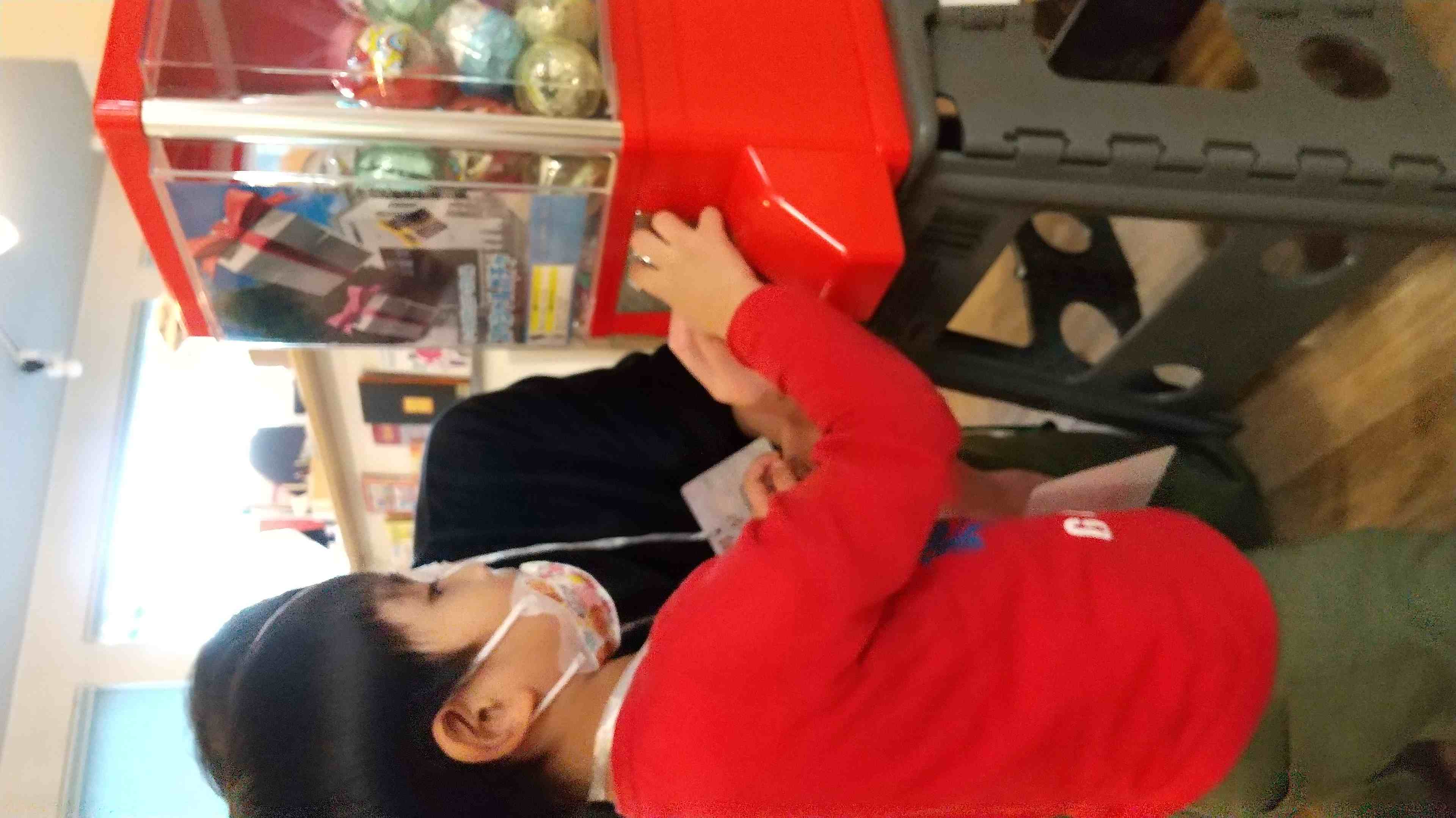 ポイントカードを受け取って、射的、輪投げ、魚釣りの3つのブースを回り、それぞれクリアしたらポイントカードに謎のひらがなを貰うシステムで行いました。そして、その謎を解くと宝箱の鍵が!宝箱を開けてみると、ガチャマシンのメダル…?