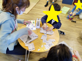 職員の補助なく、折り方を見てお子さん自身で完成させることができていました!完成させたあとは、兜をかぶって「殿様だぞー!」とごっこ遊びをして楽しんでおりました!