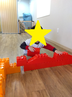 こちらの活動では、レゴブロックより数倍大きいブロック「トイブロック」を使った遊びとなっております!