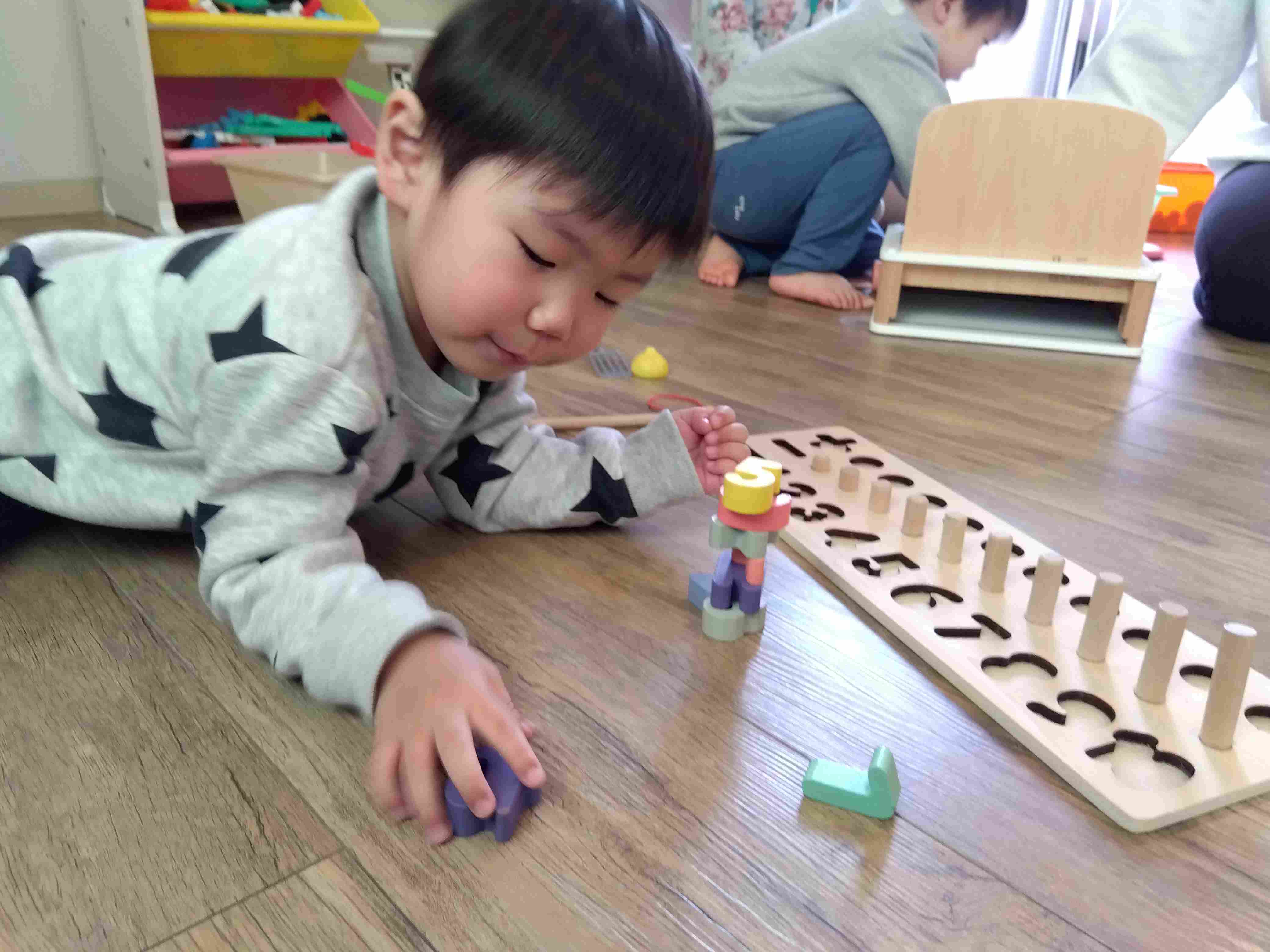 このお子さんは、数字のブロックを手にしてどんどん積み重ねており、数字も好きだしバランスよく積み上げるのも好きだし、という2つの遊びを両立していました!