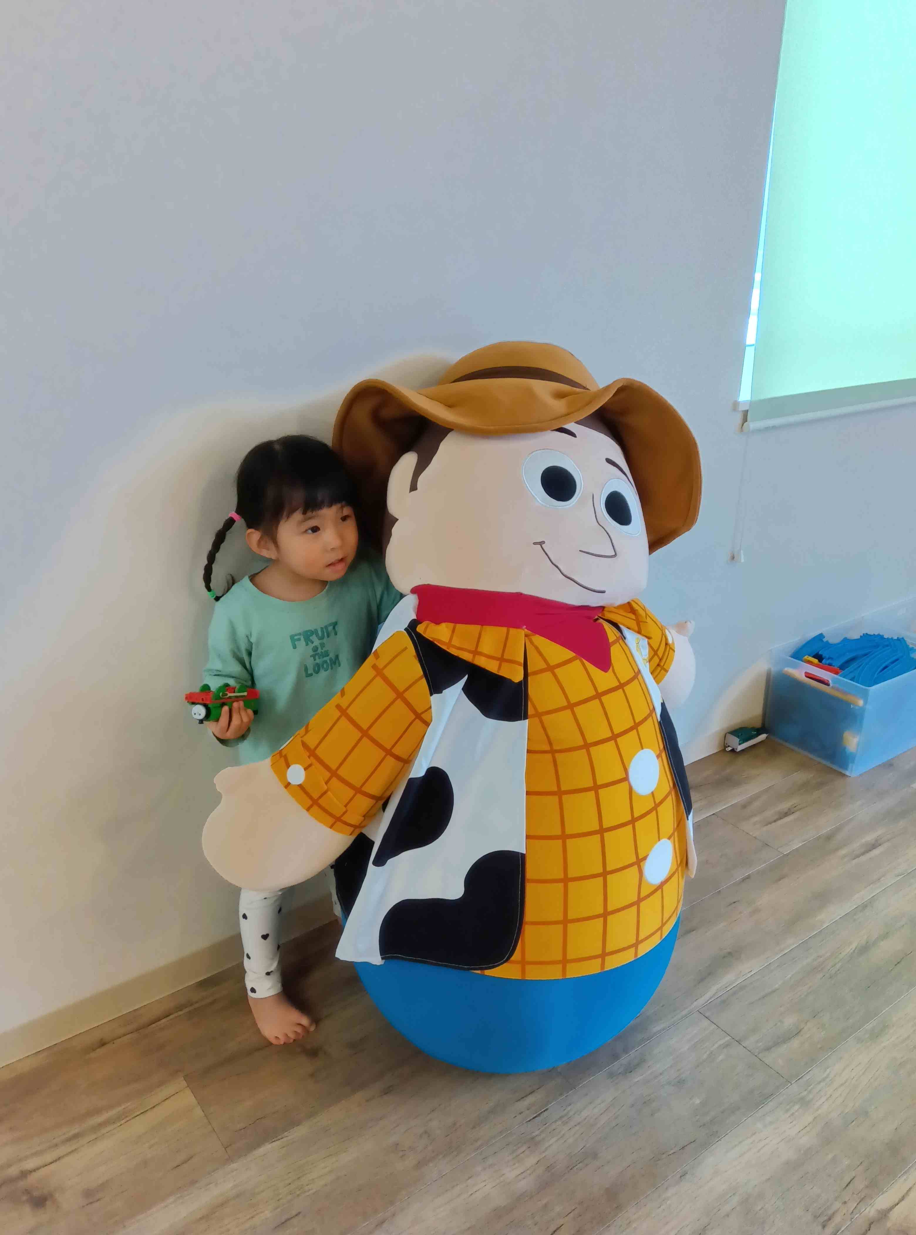 このお子さん、ウッディのヨギボーがお気に入りで、プラレールをウッディに貸してあげたり、後ろから抱きしめたりと、なんとも可愛らしい遊び方をしてくれます。ウッディも大喜び!