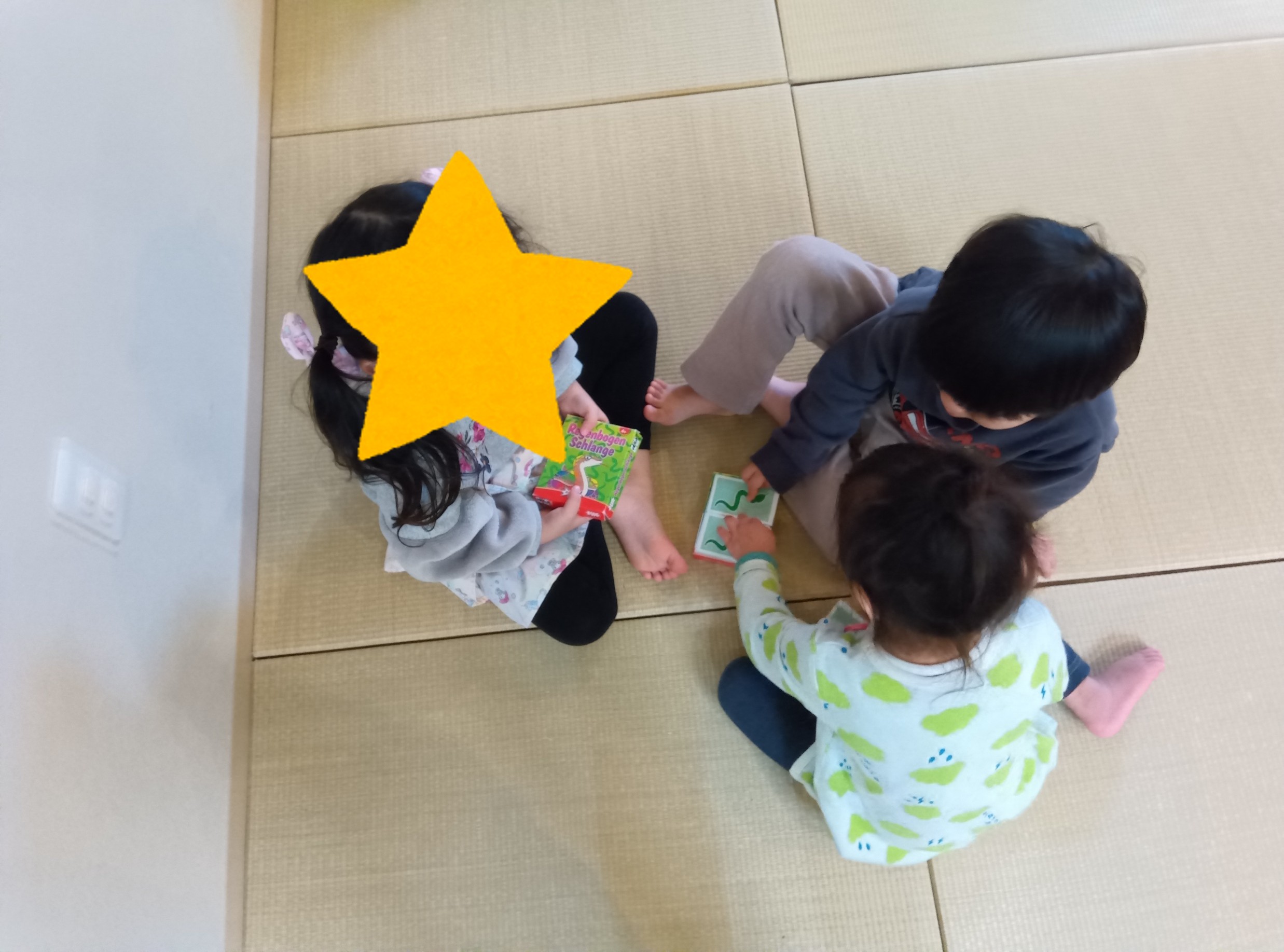 ひょんなことから始まった「にじいろのヘビ」。このカードゲーム、ルールがわかりやすくてお子さんたちのなかにも、好きな子はたくさんいます!そんな「にじいろのヘビ」で遊んだ後の一コマ…。