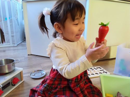 ごっこ遊びは、食べ物や作る動作などから、単語から2語文(にんじん きる)など言葉の発達を自然と遊びの中で促進することができます。