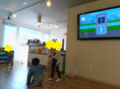 お子さんたちは信号の色を見つつ、ボールを集めており、「赤」になったときはその場にしっかり立ち止まることができていました!