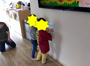 子どもたちは見つけるとすぐに張りに行って、こちらから貼り方を指示していなかったのですが綺麗に横一列に貼ってくれていました!😊