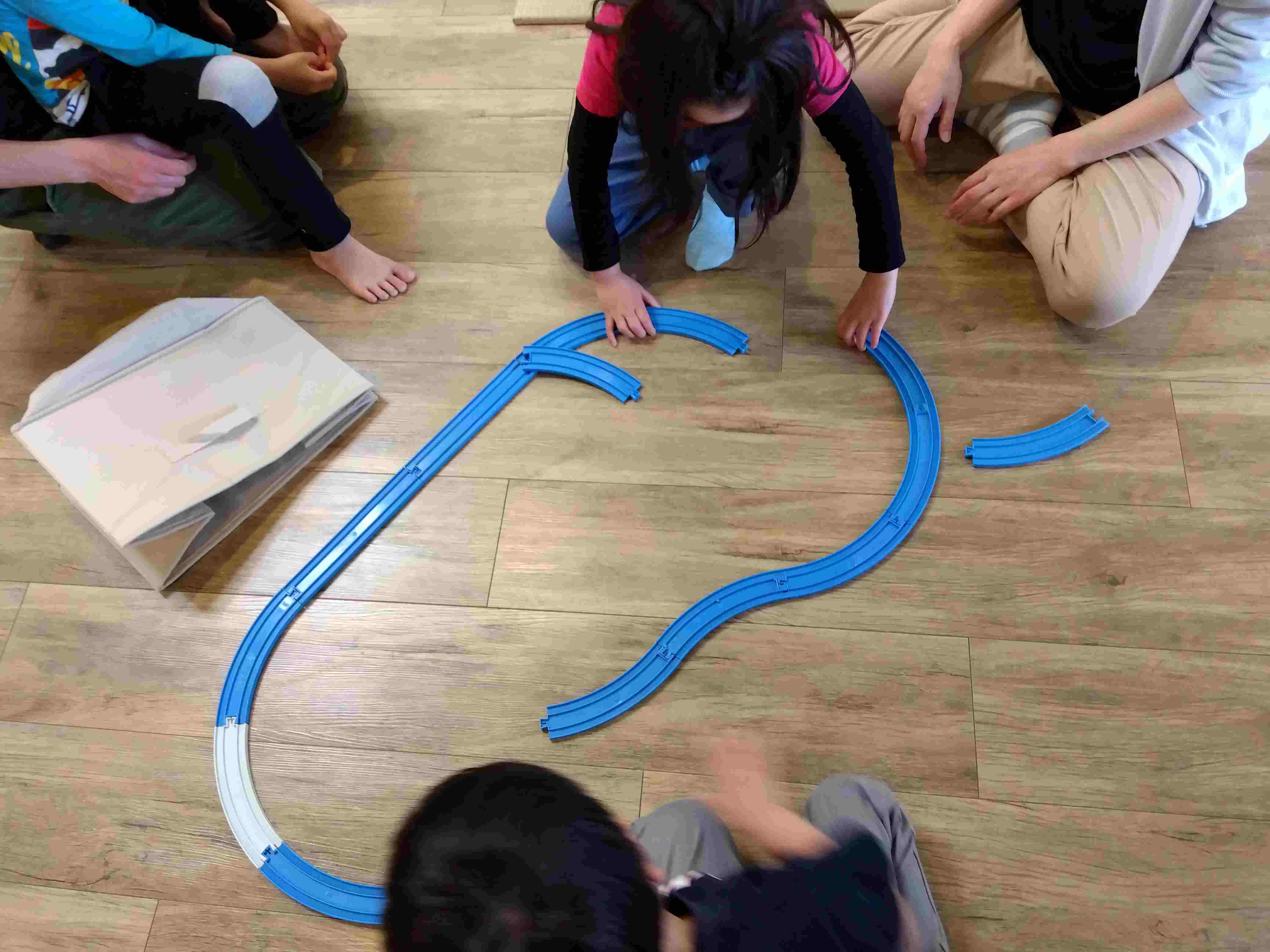 お子さんたちは、チームのお友達と協力しながら「こっちつなげてー!」「カーブちょうだい!」などと、一生懸命線路くんを助けてくれました!