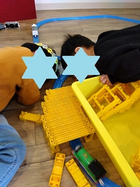 プラレールの橋脚をトンネルに見立てて遊んでいたお子さんたち。