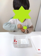 こちらの活動では、星や丸といった様々な形をしたパズルを、同じ形の穴が開いている場所にいれる活動となっております!
