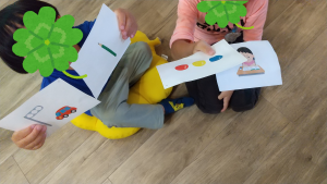 例えば自動車(タイヤが無い)を持っているお子様とタイヤのカードを持っているお子様がペアになる...という感じです。