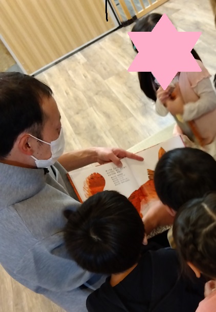 おやつを食べ終わったお子さんから好きな絵本を持ってきて読むことが出来るのですが、この日は歌で読み聞かせできる絵本をみんなで一緒に見ていました。
