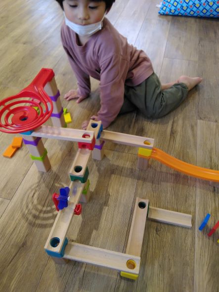今日は、施設内にある玩具のビー玉転がしをご紹介します。木のレールような物とプラスチックでできたいろいろな部品を組み合わせて、ピタゴラスのような物を作る玩具です。写真のように最後に鈴を置くことで、そこにビー玉が入るととても綺麗な音がします。