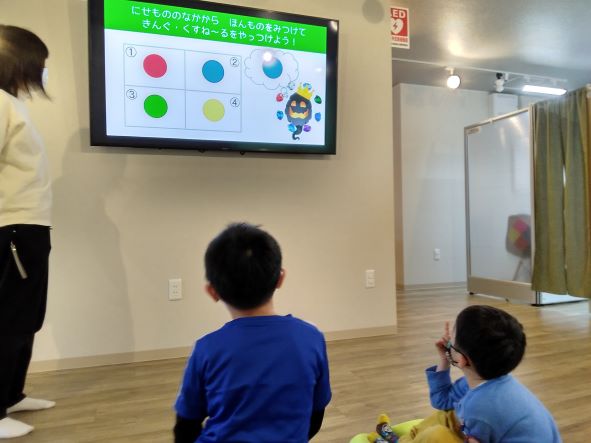 本日のお子さんたちもモニターを最後まで集中してみており、答える際はみんなで声を合わせて答えることができていました!