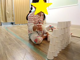 こちらの活動では、指定された数の紙コップをタワーのように積み立てていく課題となっています!しかし、お子さんたちが積み立てている間に、敵役の職員が紙コップタワーを壊そうとして、集中力を散漫させてきます!