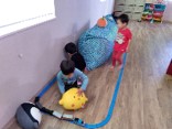 やはり、一番人気はプラレールです。走る電車を見るだけではなく、この写真のようにクッションをトンネルにしてしまう発想力が凄いですね。横目で見る電車と覗き込んでみる電車はスケールが違うのだと思います。物をいろんな視点から見ることは大切なことです。