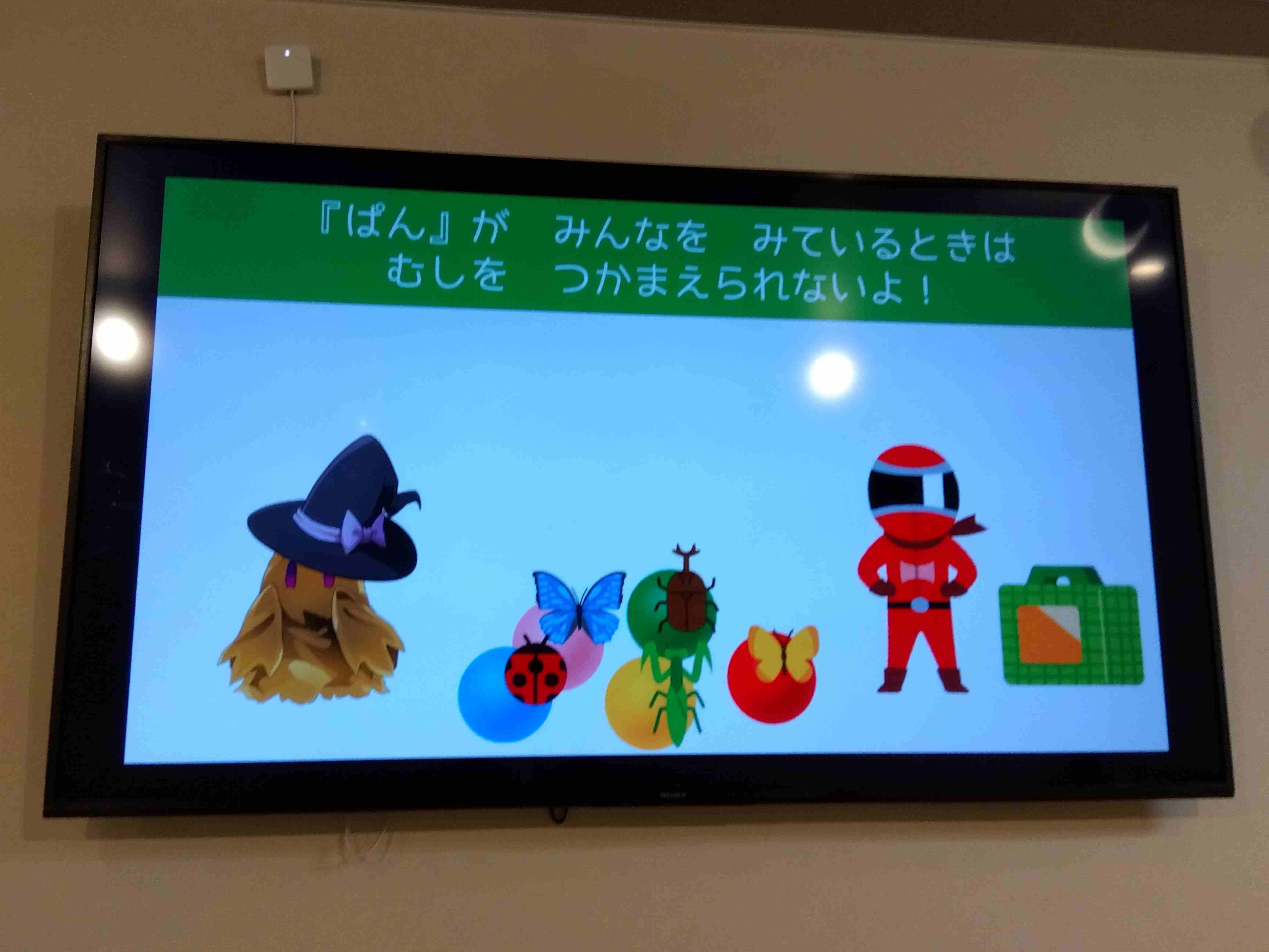 今週は、お子さんたちもよく知っている「だるまさんがころんだ」をベースに、鬼役の職員が見ていない時に、モニターに表示されたイラストが付いたボールを取ってくる、というものを行いました。