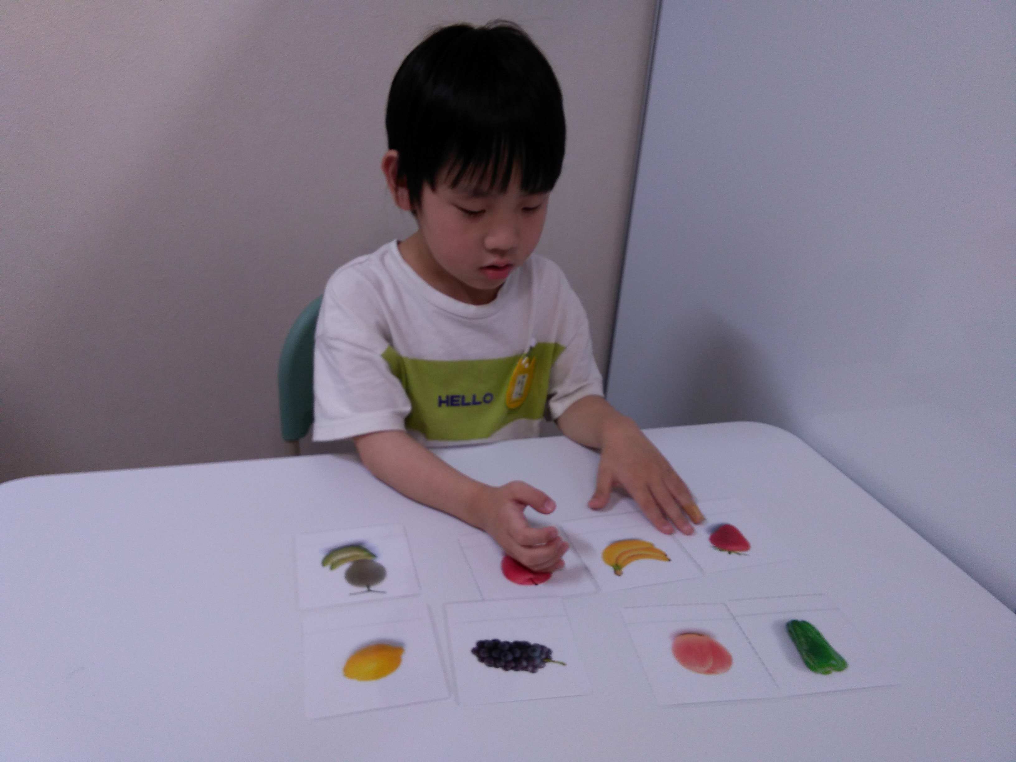 動物・野菜・果物などの写真やイラストの付いたカードを見てその名前を教えてもらいました。