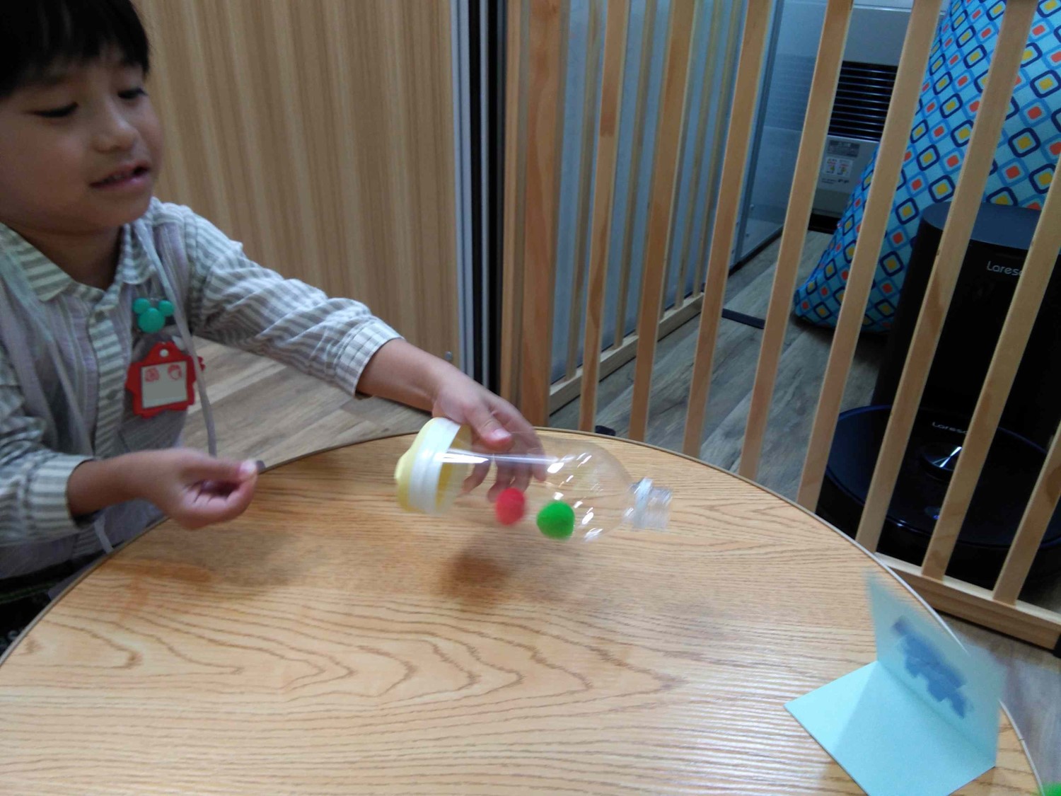 風船部分をつまむためには、親指、人差し指、中指を動かすことが必要ですし、全然違う動きではありますが、その三指は食具や鉛筆を使うときに重要なものとなります。輪ゴム鉄砲も考えましたが、せっかくなので指の運動もしちゃおう!ということから空気砲となりました。