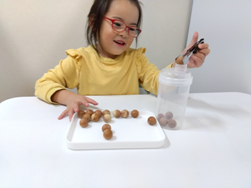この課題ではトングを使用し、木のボールをケースに移動する課題です!