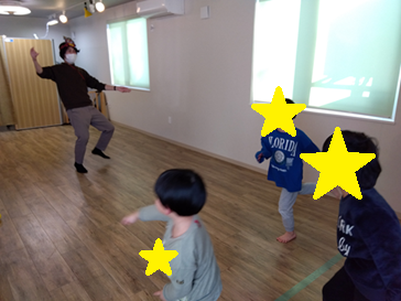 活動では、「スーパー豆」と作るために、鬼の近くにある「豆カード」を集めるのが目的となります。しかし、鬼に見つかるとスタートに戻されてしまうため、鬼に見つからないようにカードを取りに行く、「だるまさんが転んだ」のような活動となっております!