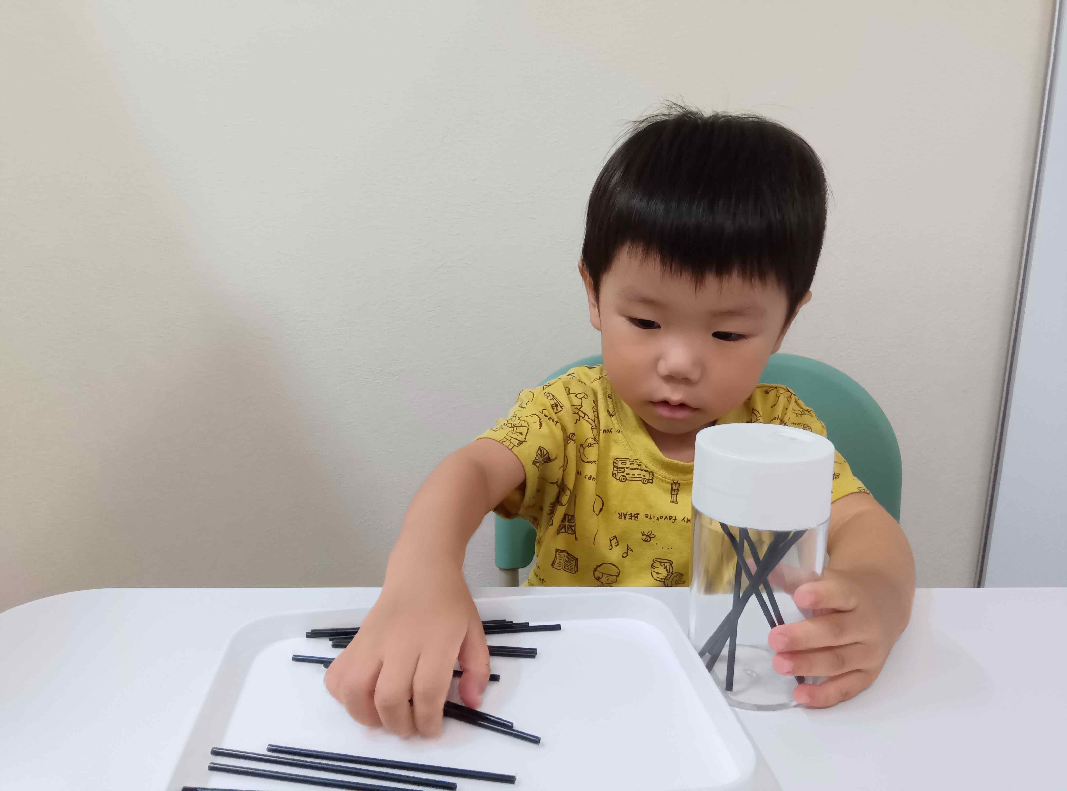 お子さんが一生懸命取り組んでいるのは、ストロー(厳密にはロリポップスティックという製菓用品なんですが)をスパイスボトルに入れる課題です。