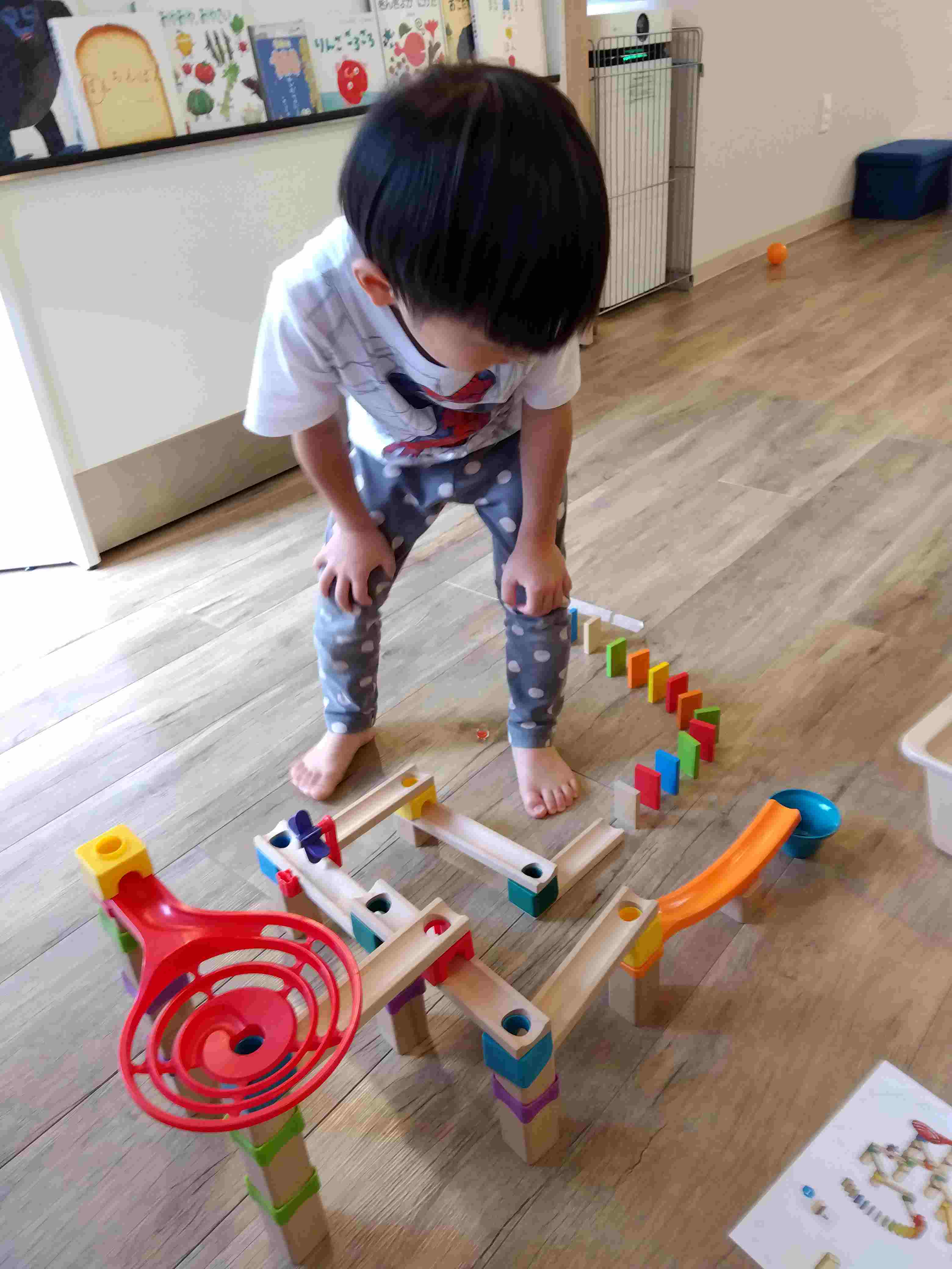 こちらの遊びでは、木のレーンや積み木、風車やすべり台を使ってピタゴラスイッチを作る遊びとなっております!
