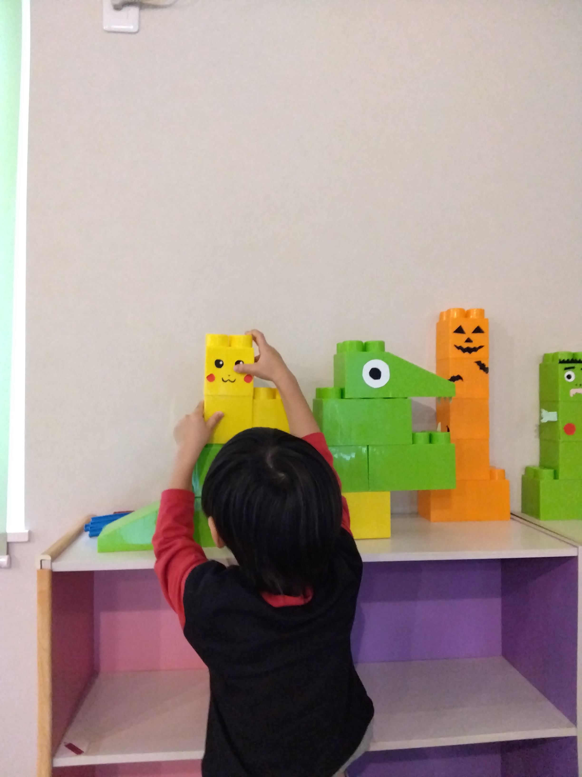 自分の組み立てたブロックにも目と歯を付けたいということで、