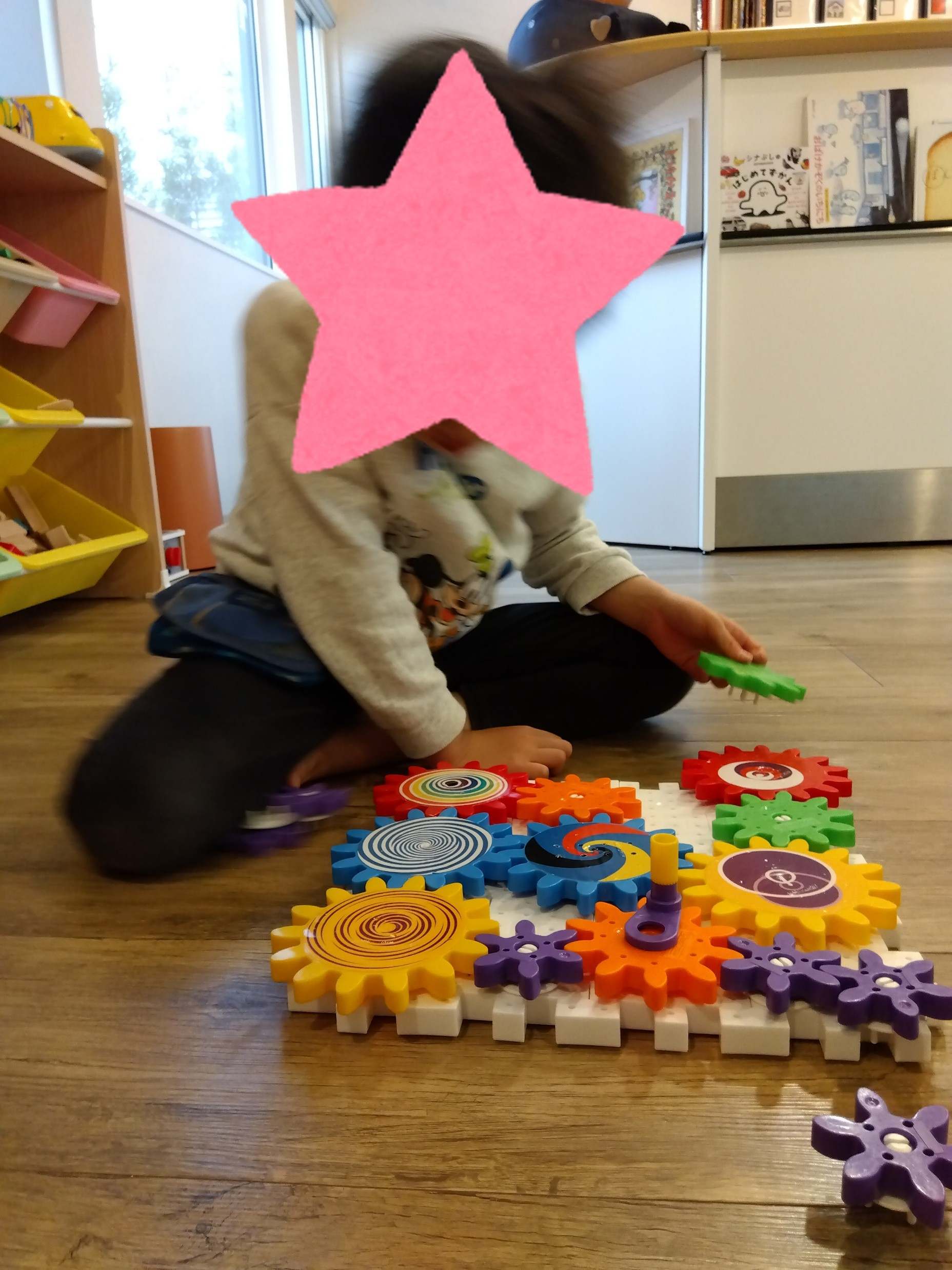 また、どこにどんなふうにつなげればうまく動くかな?と考えることで、空間をイメージする力や「どうすればうまくいくか」を考える力も育ちます。自分で回したギアが、つながったほかのギアを動かす様子を見ると、「こうするとこうなるんだ!」と原因と結果の関係がわかってきて、物の仕組みに興味を持つきっかけにもなります。