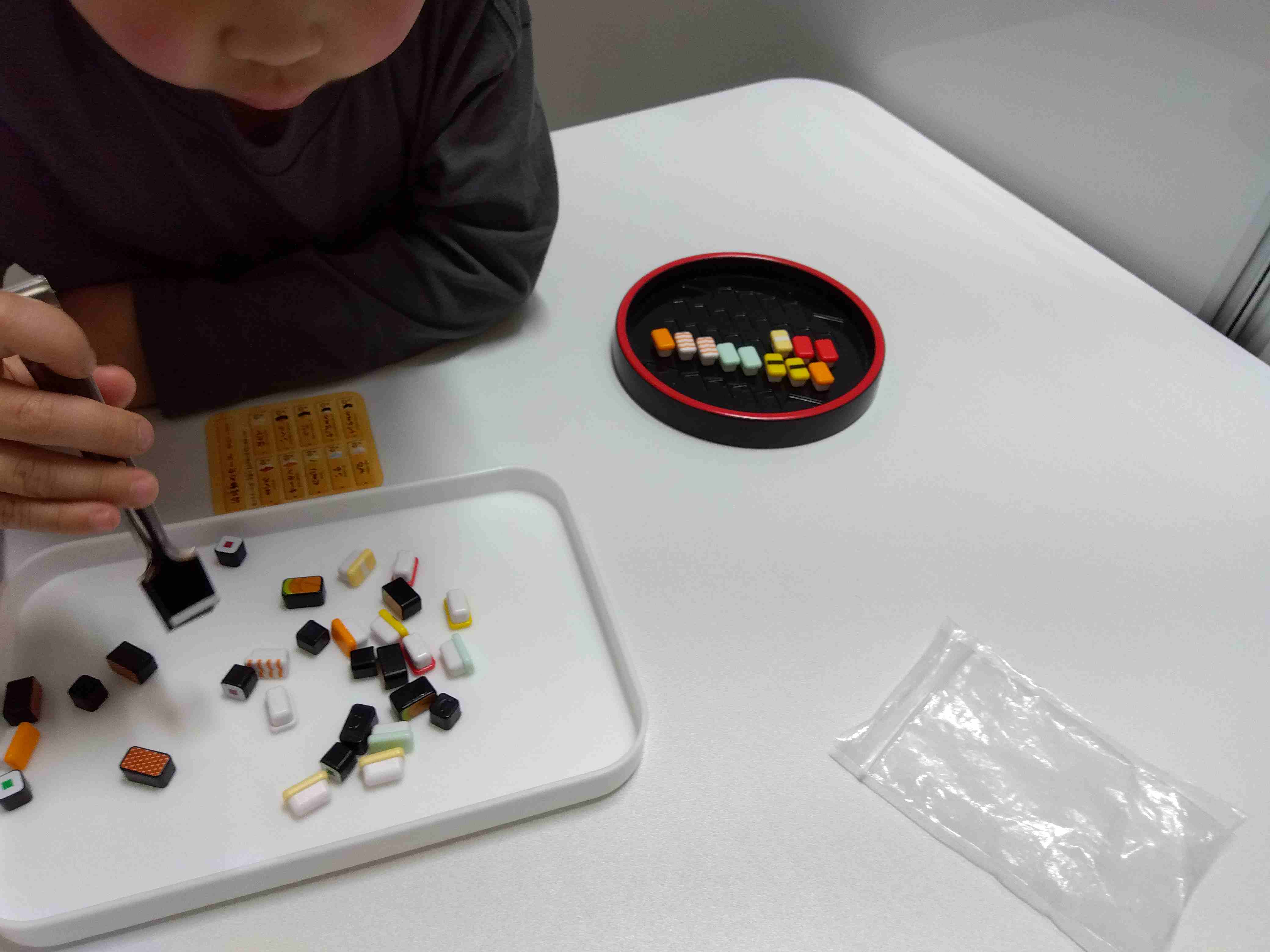 このお子さん、「マナー豆まめ寿司」を使って、お箸の操作練習を行っています。でも、このサイズのお寿司を箸を使って持つとなると、それはそれは大変ですよね?なので、スマイルではシュガートングを使っています。
