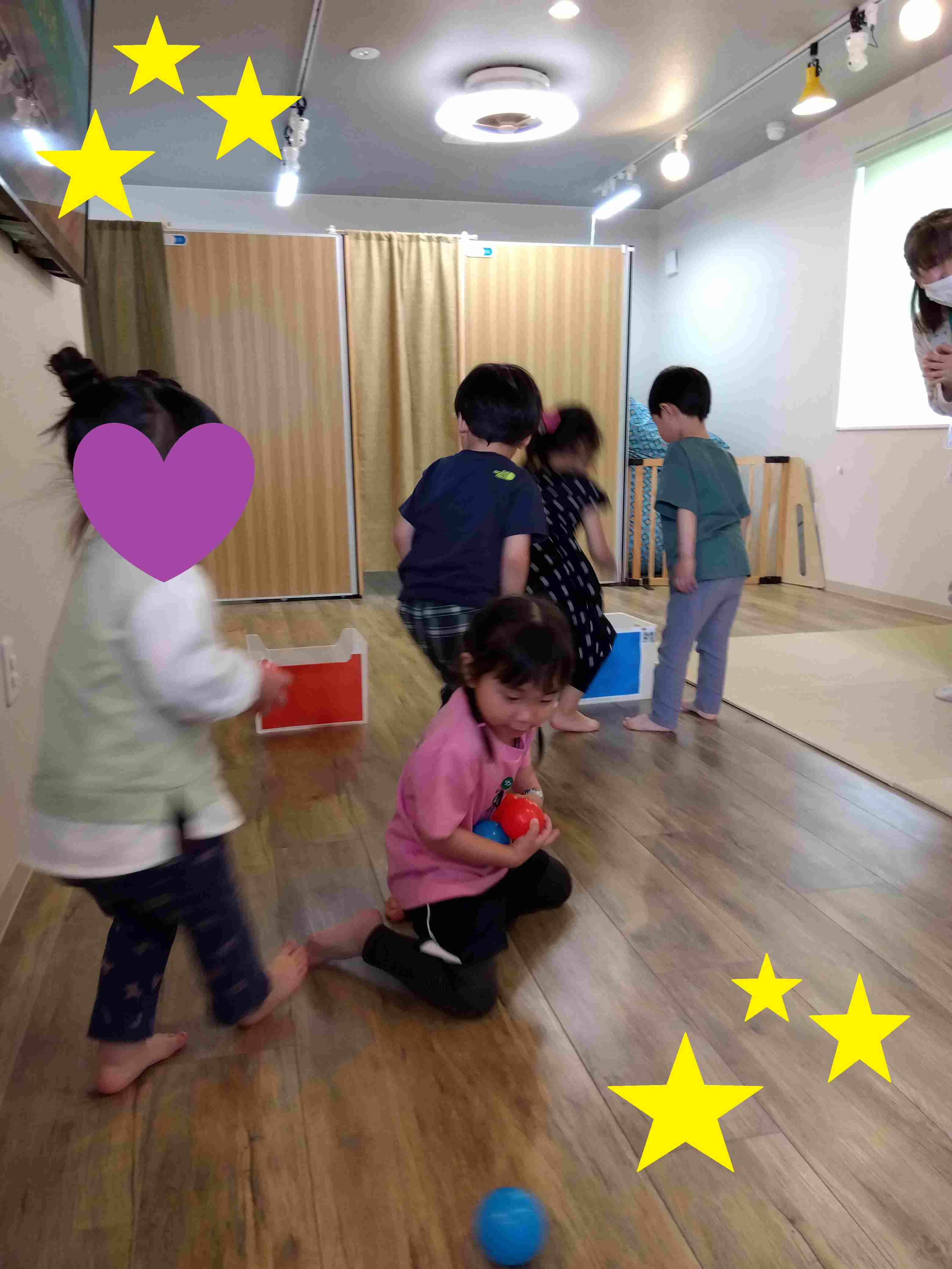 赤と青のボールをそれぞれ同じ色の箱に入れるというとてもシンプルな内容の活動。近くに落ちているボールを拾って箱の前で色分けをしているお子さんや、赤色だけのボールを集めていくお子さんなど、それぞれのやり方で「できたー!!」と楽しく取り組んでいます♪