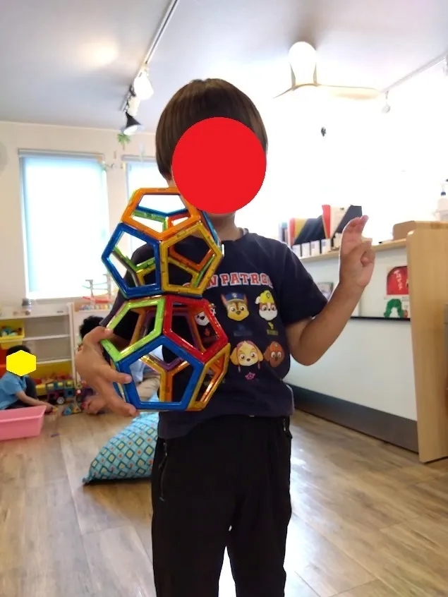 五角形のマグフォーマーを上手に繋げて雪だるまにしていました🎶