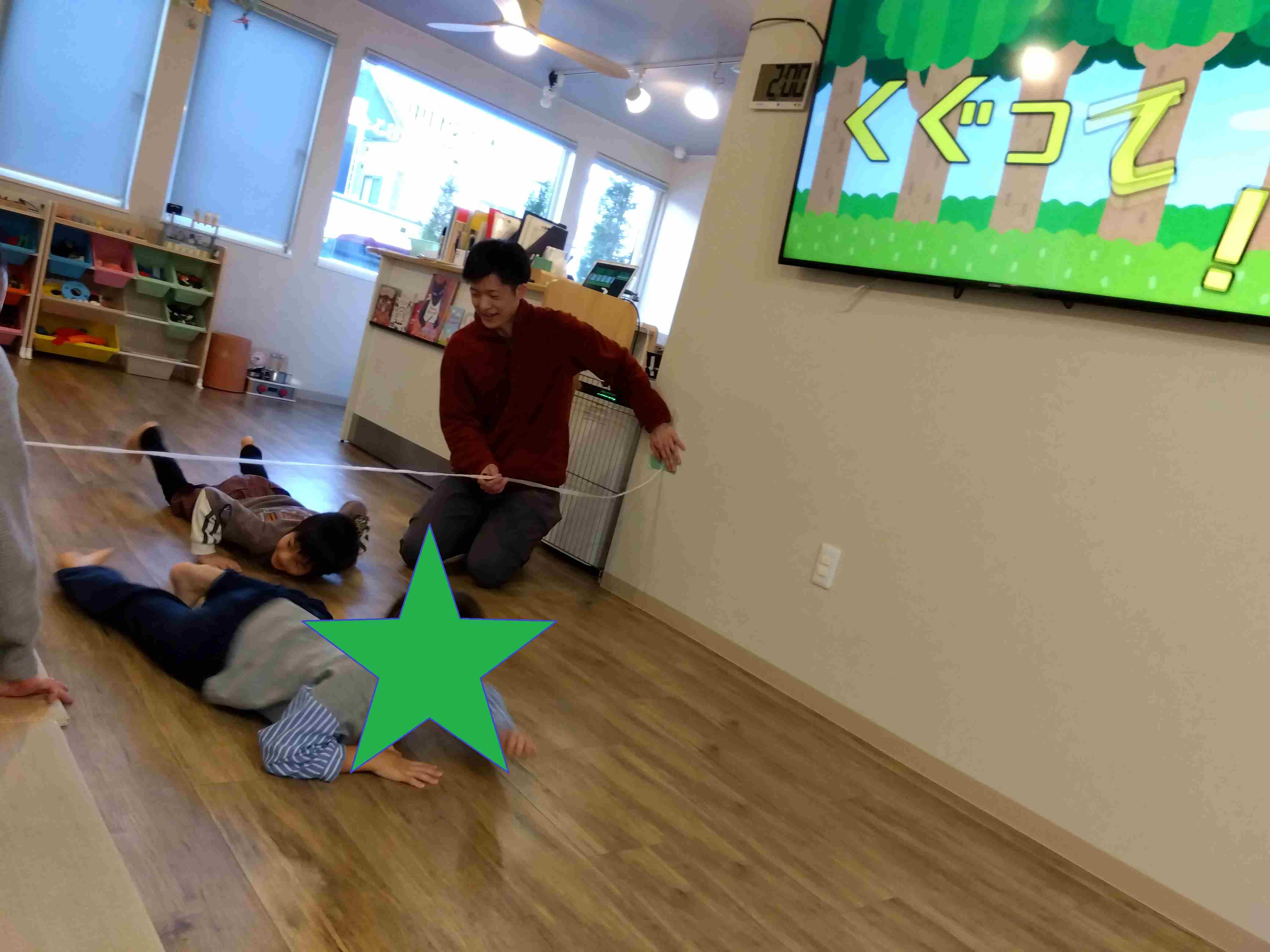 職員が持つテープを協力して持ってくれる